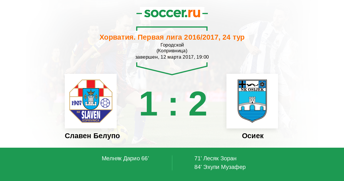 Хорватия. Первая лига 16.03.2012 Славен Белупо Логотип футбольный клуб Славен Белупо (Копривница) 2:0 Логотип футбольный клуб Осиек Осиек