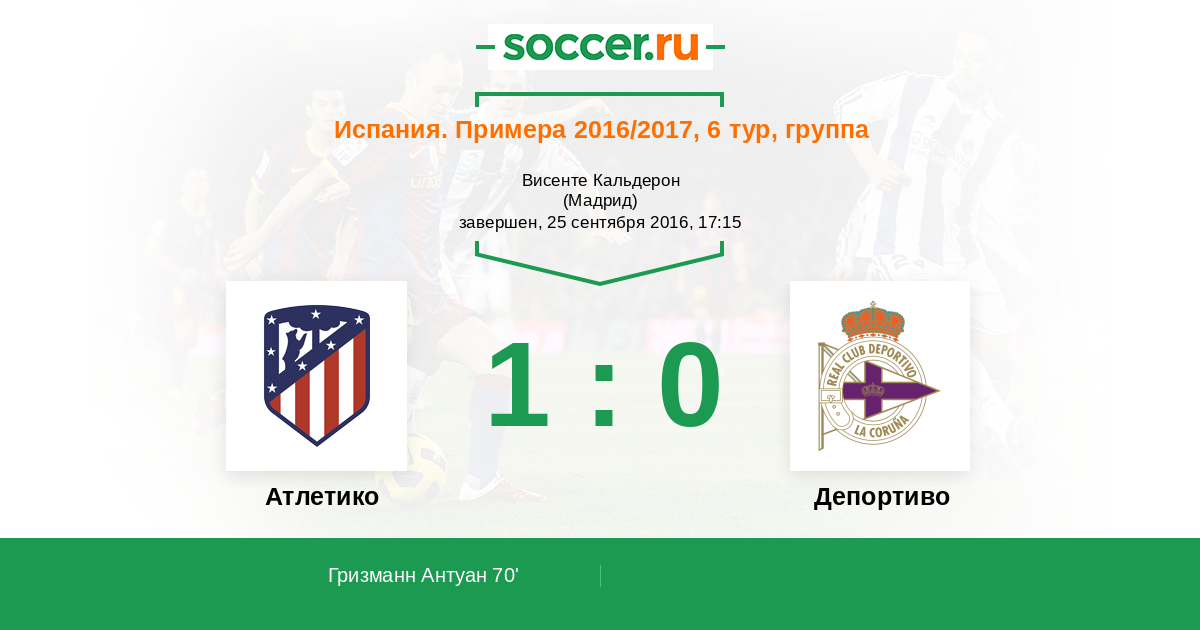 Испания. Примера 12.03.2016 Атлетико Логотип футбольный клуб Атлетико (Мадрид) 3:0 Логотип футбольный клуб Депортиво (Ла-Корунья) Депортиво