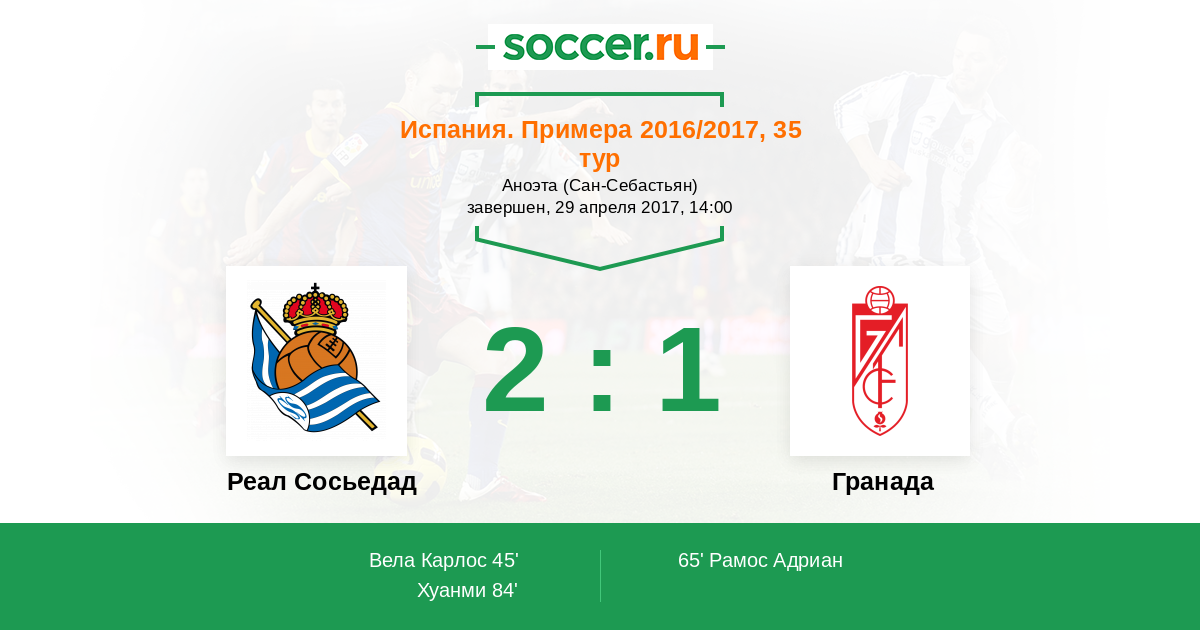 Испания. Примера 17.12.2016 Гранада Логотип футбольный клуб Гранада 0:2 Логотип футбольный клуб Реал Сосьедад (Сан-Себастьян) Реал Сосьедад