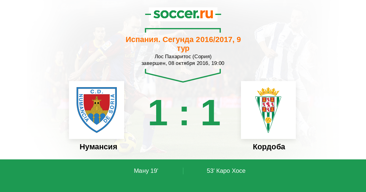 Испания. Сегунда 29.10.2017 Кордоба Логотип футбольный клуб Кордоба 1:1 Логотип футбольный клуб Нумансия (Сория) Нумансия