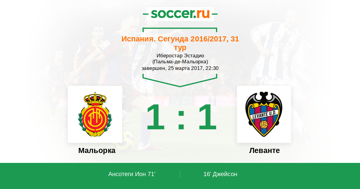 Испания. Сегунда 15.10.2016 Леванте Логотип футбольный клуб Леванте (Валенсия) 2:1 Логотип футбольный клуб Мальорка (Пальма-де-Мальорка) Мальорка
