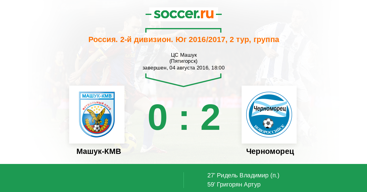 Россия. Вторая лига. Группа 1 24.05.2016 Машук-КМВ Логотип футбольный клуб Машук-КМВ (Пятигорск) 1:1 Логотип футбольный клуб Черноморец (Новороссийск) Черноморец