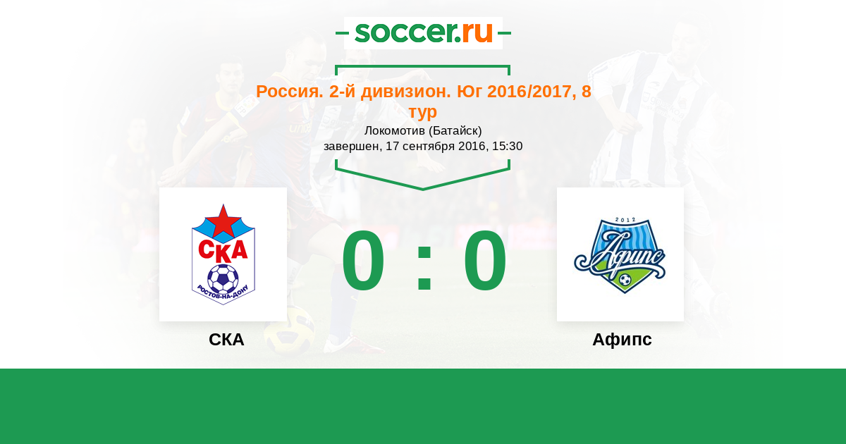Россия. Вторая лига. Группа 1 09.04.2017 Афипс Логотип футбольный клуб Афипс (Афипский) 2:0 Логотип футбольный клуб СКА (Ростов-на-Дону) СКА