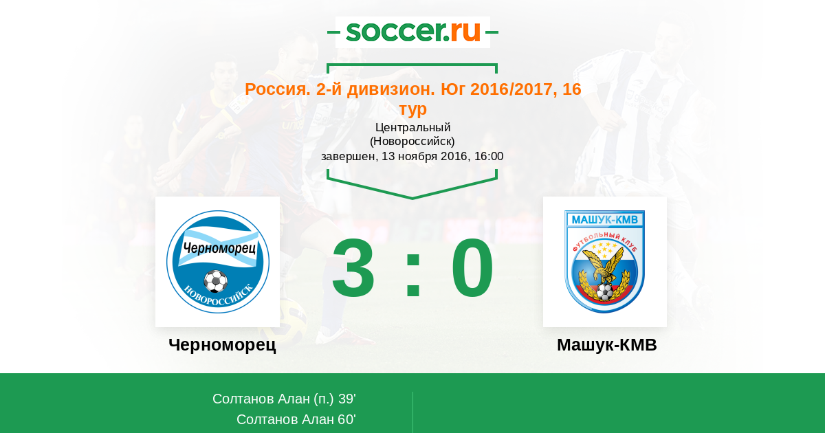Россия. Вторая лига. Группа 1 04.08.2016 Машук-КМВ Логотип футбольный клуб Машук-КМВ (Пятигорск) 0:2 Логотип футбольный клуб Черноморец (Новороссийск) Черноморец