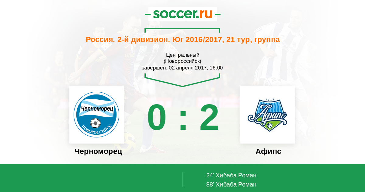 Россия. Вторая лига. Группа 1 04.08.2017 Афипс Логотип футбольный клуб Афипс (Афипский) 2:0 Логотип футбольный клуб Черноморец (Новороссийск) Черноморец