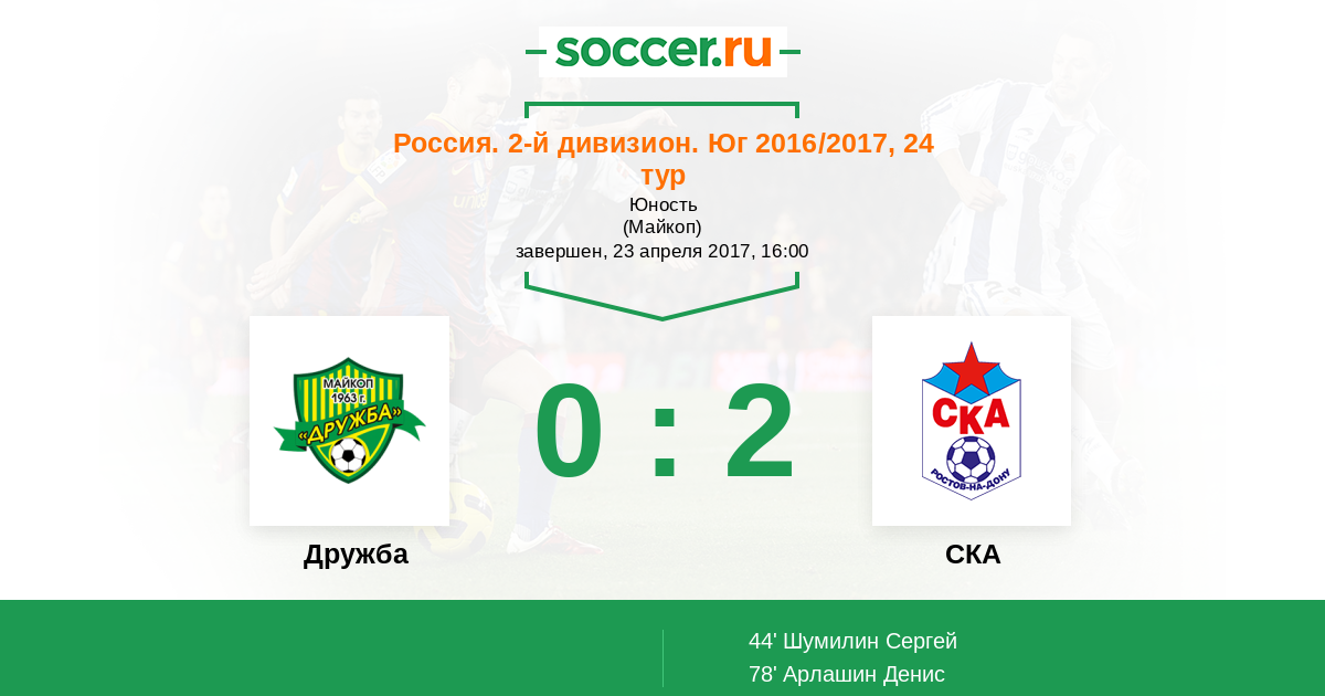 Россия. Вторая лига. Группа 1 03.04.2016 Дружба Логотип футбольный клуб Дружба (Майкоп) 0:1 Логотип футбольный клуб СКА (Ростов-на-Дону) СКА
