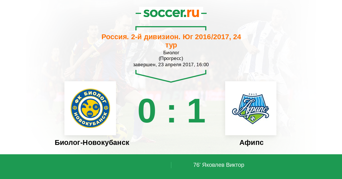 Россия. Вторая лига. Группа 1 23.09.2017 Афипс Логотип футбольный клуб Афипс (Афипский) 1:0 Логотип футбольный клуб Биолог-Новокубанск Биолог-Новокубанск