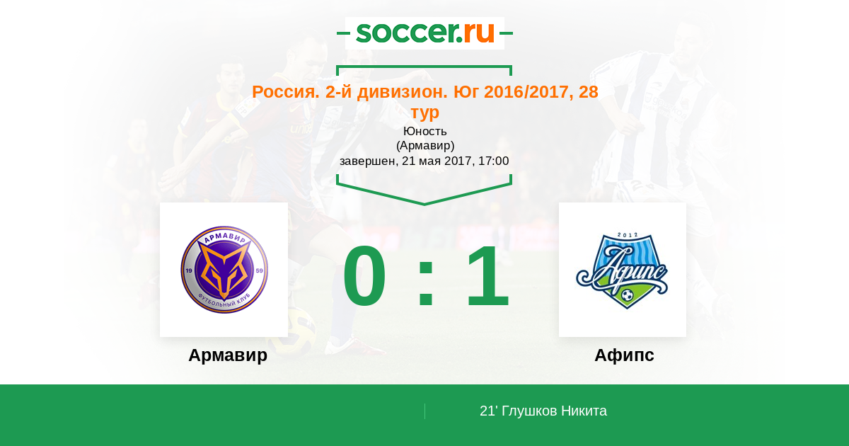 Россия. Вторая лига. Группа 1 19.08.2017 Армавир Логотип футбольный клуб Армавир 1:0 Логотип футбольный клуб Афипс (Афипский) Афипс