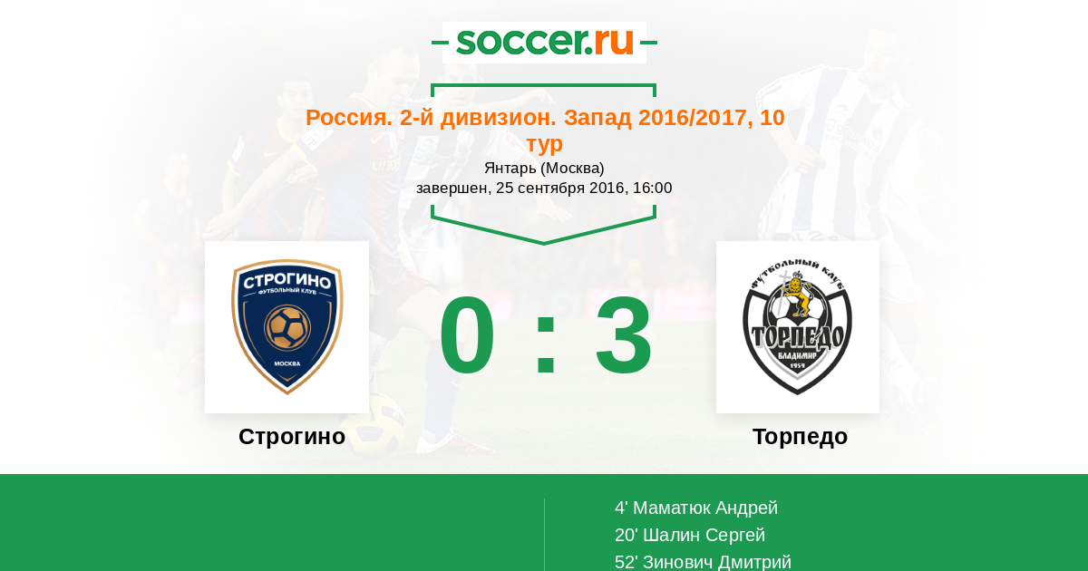 Россия. Вторая лига. Группа 2 20.04.2016 Торпедо Логотип футбольный клуб Торпедо (Владимир) 2:1 Логотип футбольный клуб Строгино (Москва) Строгино