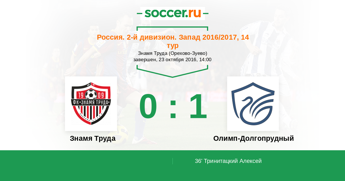 Россия. Вторая лига. Группа 2 28.07.2016 Долгопрудный Логотип футбольный клуб Долгопрудный 3:0 Логотип футбольный клуб Знамя Труда (Орехово-Зуево) Знамя Труда