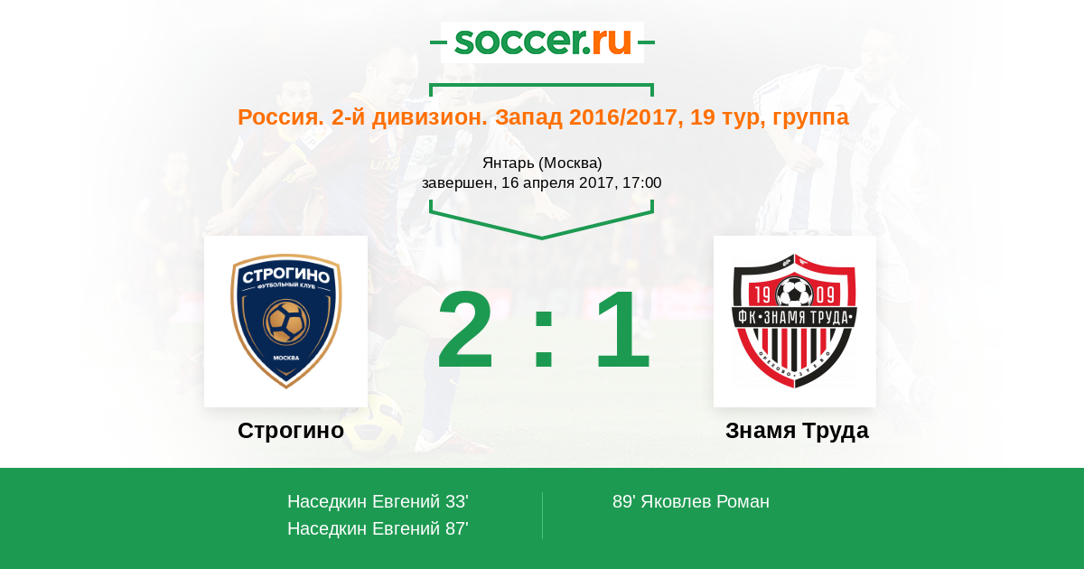 Россия. Вторая лига. Группа 2 02.09.2016 Знамя Труда Логотип футбольный клуб Знамя Труда (Орехово-Зуево) 0:0 Логотип футбольный клуб Строгино (Москва) Строгино