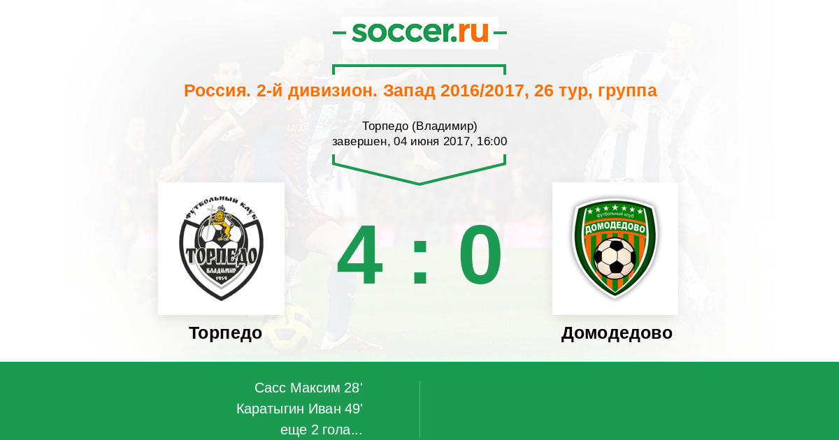 Россия. Вторая лига. Группа 2 26.05.2016 Домодедово Логотип футбольный клуб Домодедово (Москва) 0:2 Логотип футбольный клуб Торпедо (Владимир) Торпедо