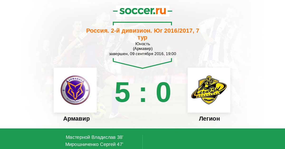 Россия. Вторая лига. Группа 1 11.10.2017 Легион Логотип футбольный клуб Легион (Махачкала) 0:1 Логотип футбольный клуб Армавир Армавир