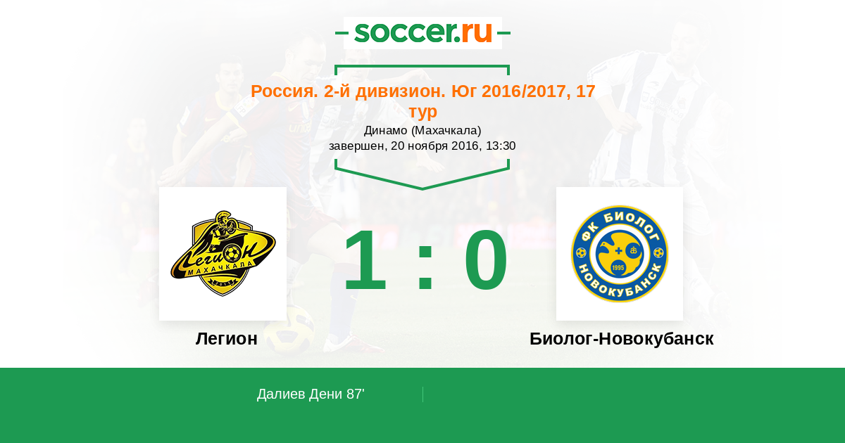 Россия. Вторая лига. Группа 1 12.08.2016 Биолог-Новокубанск Логотип футбольный клуб Биолог-Новокубанск 2:0 Логотип футбольный клуб Легион (Махачкала) Легион