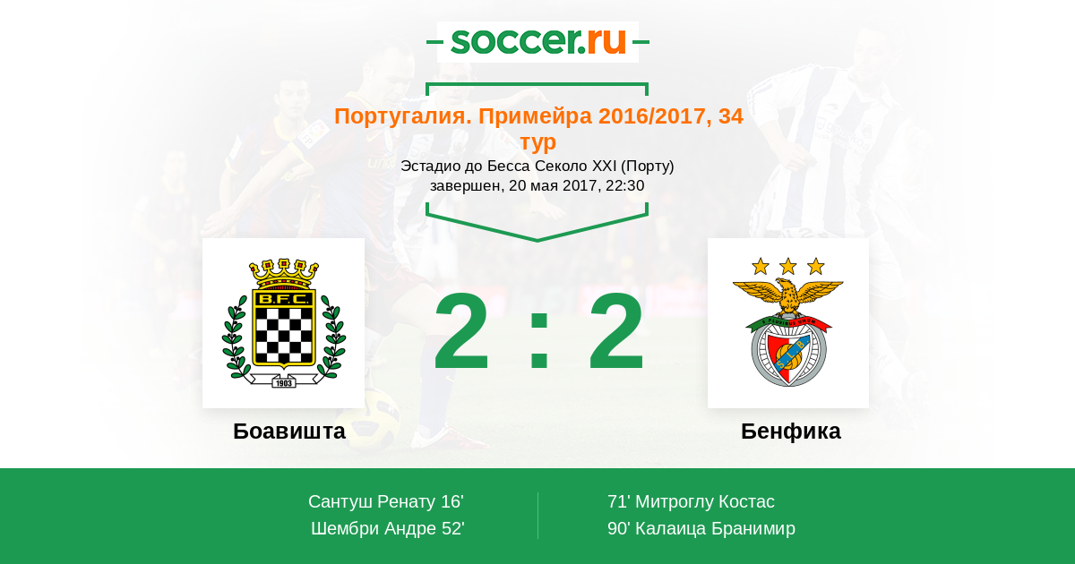 Португалия. Примейра 14.01.2017 Бенфика Логотип футбольный клуб Бенфика (Лиссабон) 3:3 Логотип футбольный клуб Боавишта (Порту) Боавишта