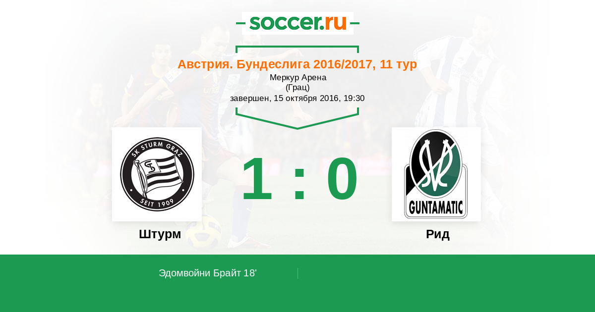Австрия. Бундеслига 30.07.2016 Рид Логотип футбольный клуб Рид 1:0 Логотип футбольный клуб Штурм (Грац) Штурм