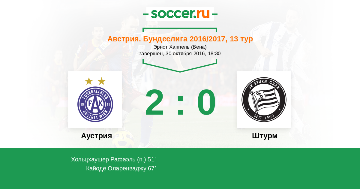 Австрия. Бундеслига 17.12.2017 Аустрия Логотип футбольный клуб Аустрия (Вена) 1:0 Логотип футбольный клуб Штурм (Грац) Штурм