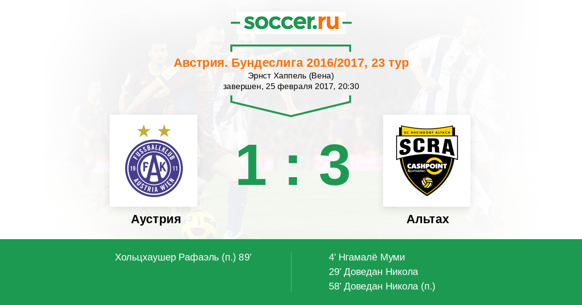 Австрия. Бундеслига 21.08.2016 Аустрия Логотип футбольный клуб Аустрия (Вена) 3:1 Логотип футбольный клуб Альтах Альтах