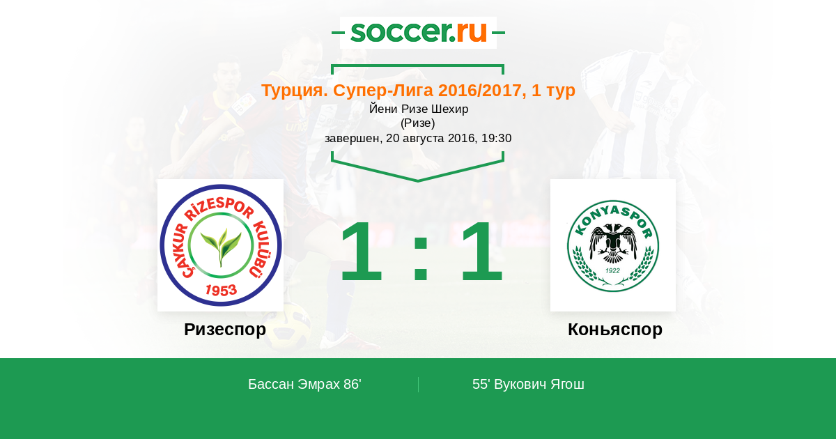 Турция. Суперлига 21.10.2018 Ризеспор Логотип футбольный клуб Ризеспор 1:1 Логотип футбольный клуб Коньяспор Коньяспор