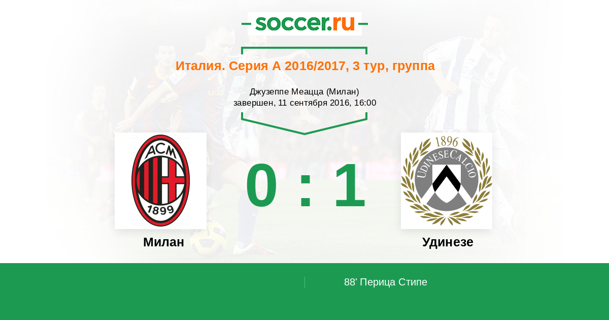 Италия. Серия А 17.09.2017 Милан Логотип футбольный клуб Милан 2:1 Логотип футбольный клуб Удинезе Удинезе