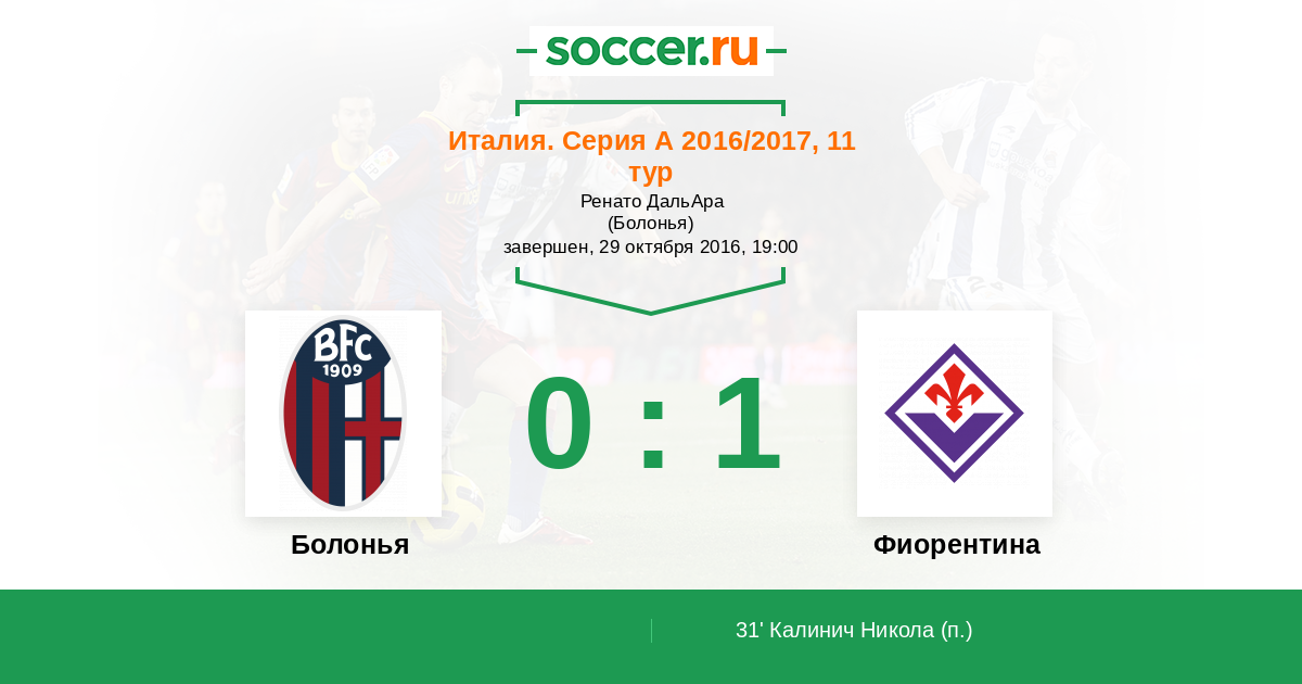 Италия. Серия А 02.04.2017 Фиорентина Логотип футбольный клуб Фиорентина (Флоренция) 1:0 Логотип футбольный клуб Болонья Болонья