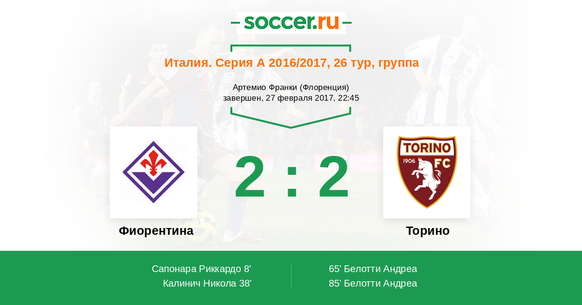 Италия. Серия А 22.02.2015 Фиорентина Логотип футбольный клуб Фиорентина (Флоренция) 1:1 Логотип футбольный клуб Торино (Турин) Торино