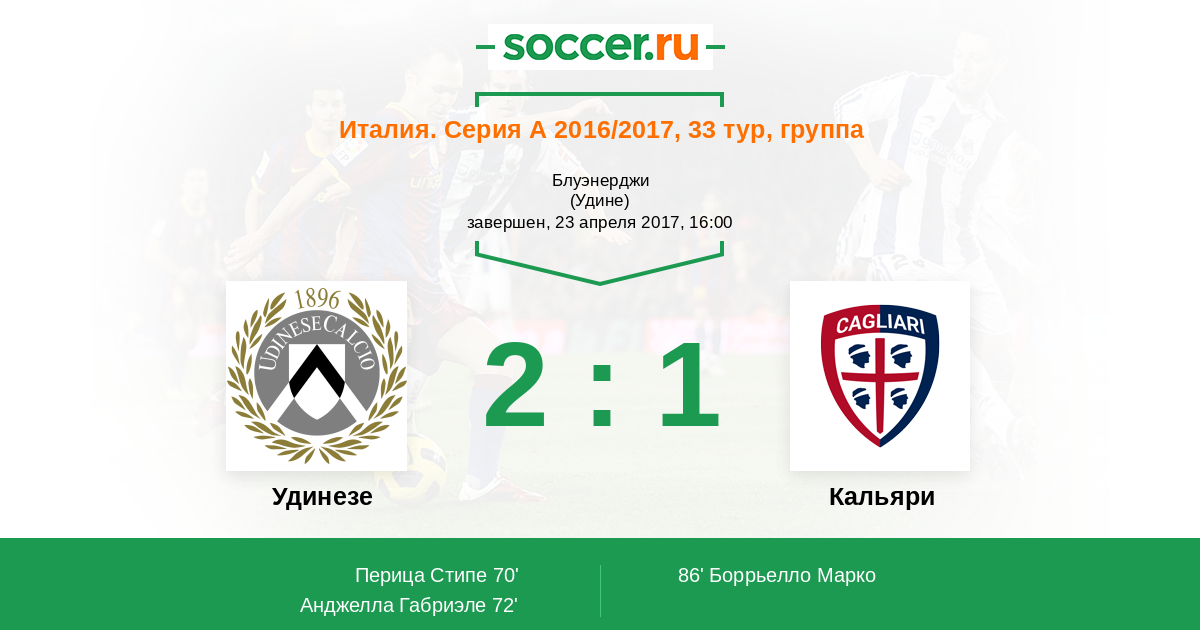 Италия. Серия А 27.11.2016 Кальяри Логотип футбольный клуб Кальяри 2:1 Логотип футбольный клуб Удинезе Удинезе