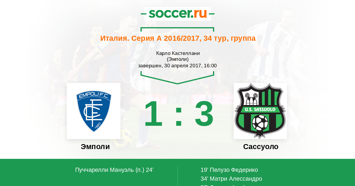 Италия. Серия А 04.12.2016 Сассуоло Логотип футбольный клуб Сассуоло 3:0 Логотип футбольный клуб Эмполи Эмполи