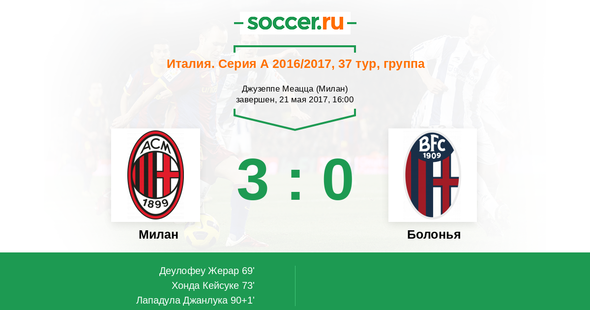 Италия. Серия А 07.05.2016 Болонья Логотип футбольный клуб Болонья 0:1 Логотип футбольный клуб Милан Милан