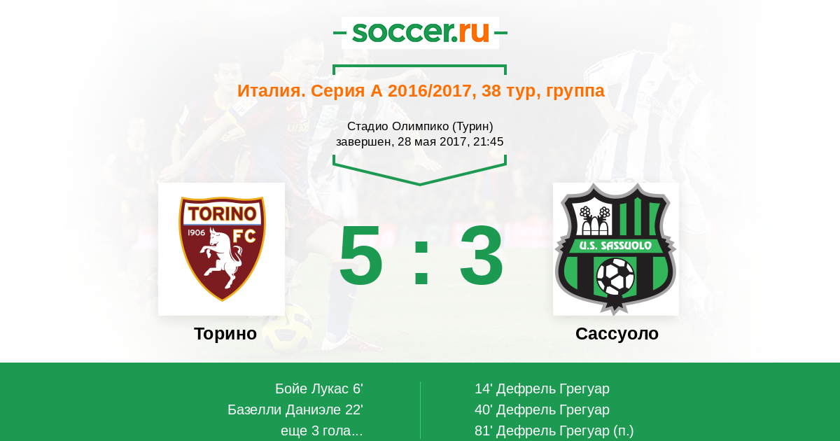 Италия. Серия А 27.08.2017 Торино Логотип футбольный клуб Торино (Турин) 3:0 Логотип футбольный клуб Сассуоло Сассуоло