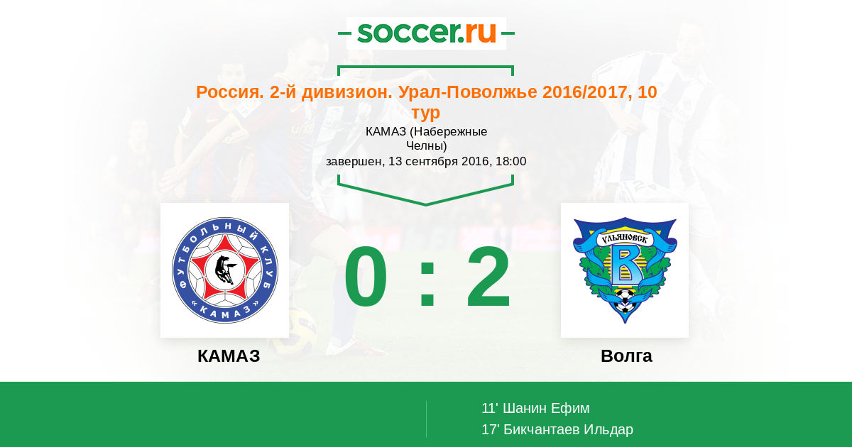 Россия. Вторая лига. Группа 4 28.07.2016 Волга Логотип футбольный клуб Волга (Ульяновск) 1:0 Логотип футбольный клуб КАМАЗ (Набережные Челны) КАМАЗ