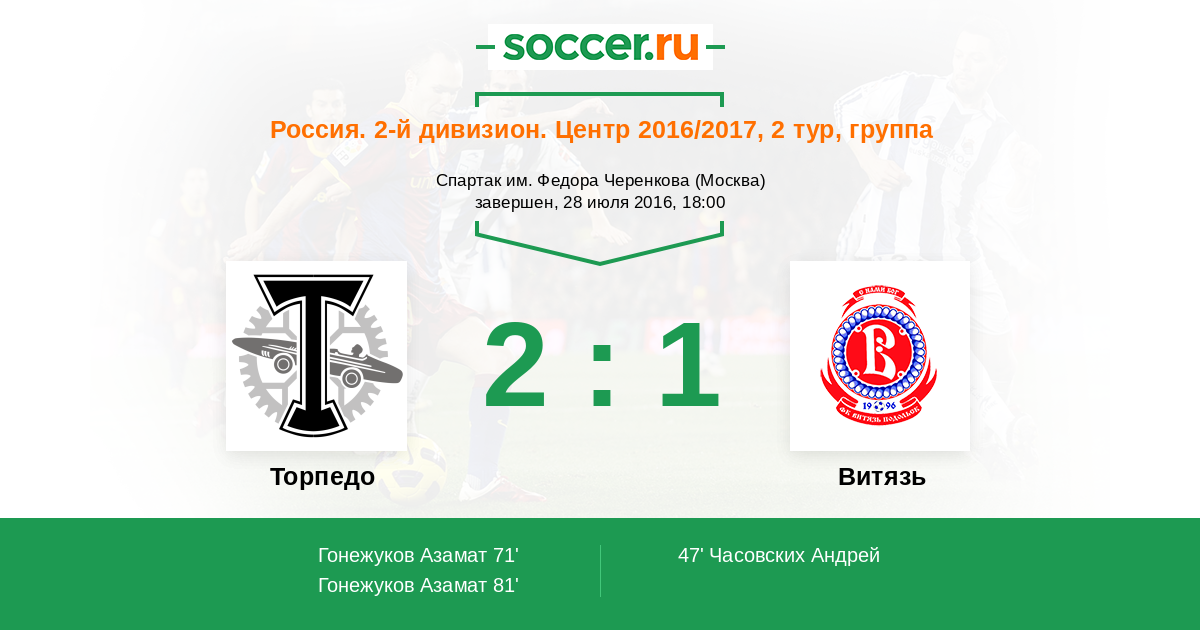 Россия. Вторая лига. Группа 3 17.04.2016 Торпедо Логотип футбольный клуб Торпедо (Москва) 1:3 Логотип футбольный клуб Витязь (Подольск) Витязь