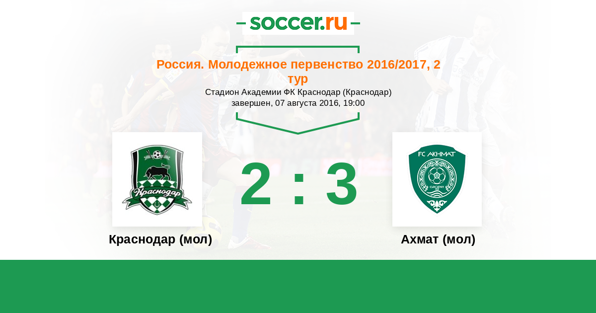 Россия. Премьер-Лига U21 09.08.2017 Ахмат (мол) Логотип футбольный клуб Ахмат (мол) (Грозный) 1:2 Логотип футбольный клуб Краснодар (мол) Краснодар (мол)