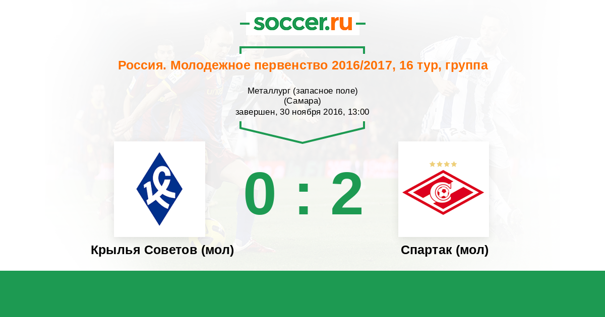 Россия. Премьер-Лига U21 06.11.2009 Крылья Советов (мол) Логотип футбольный клуб Крылья Советов (мол) (Самара) 2:0 Логотип футбольный клуб Спартак (мол) (Москва) Спартак (мол)