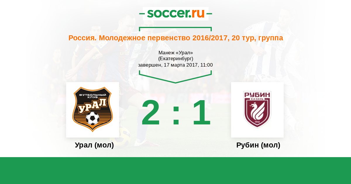 Россия. Премьер-Лига U21 16.09.2017 Рубин (мол) Логотип футбольный клуб Рубин (мол) (Казань) 3:1 Логотип футбольный клуб Урал (мол) (Екатеринбург) Урал (мол)