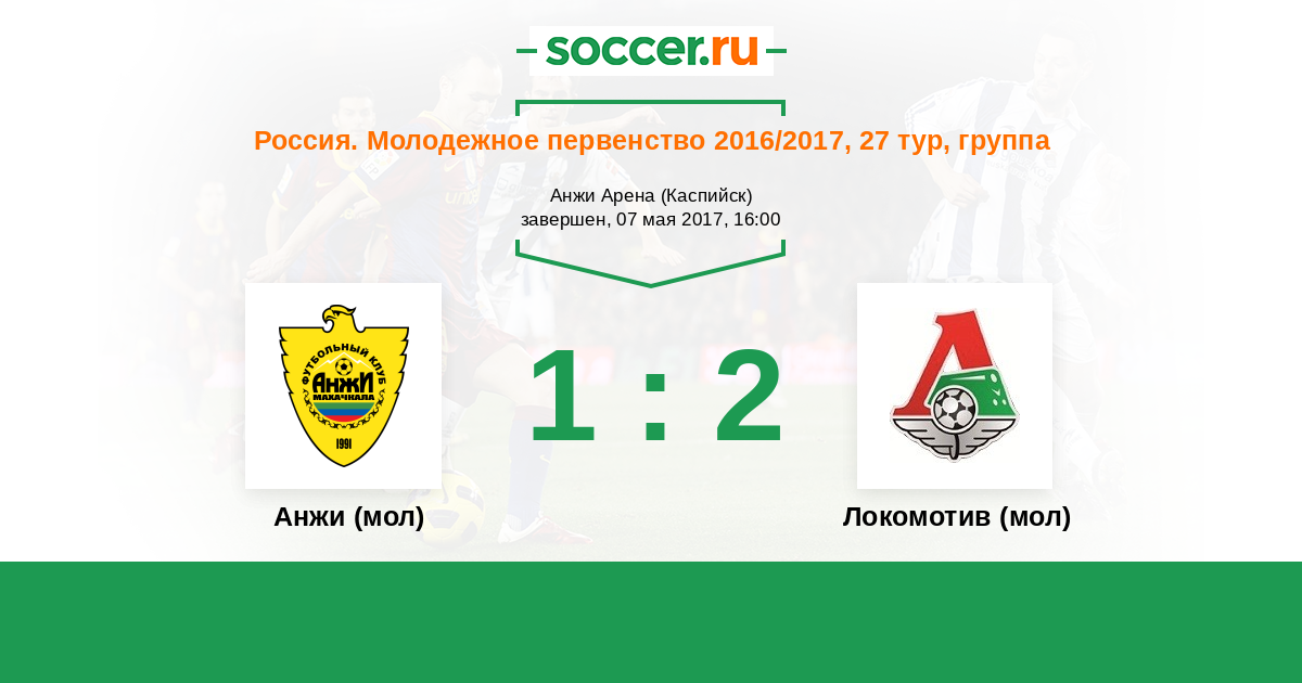 Россия. Премьер-Лига U21 29.07.2017 Локомотив (мол) Логотип футбольный клуб Локомотив (мол) (Москва) 4:0 Логотип футбольный клуб Анжи (мол) (Махачкала) Анжи (мол)