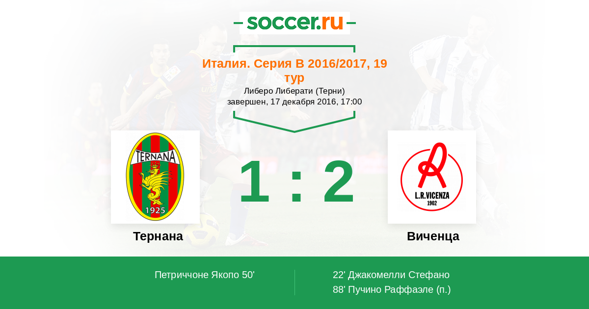 Италия. Серия В 16.04.2016 Виченца Логотип футбольный клуб Виченца 2:1 Логотип футбольный клуб Тернана (Терни) Тернана