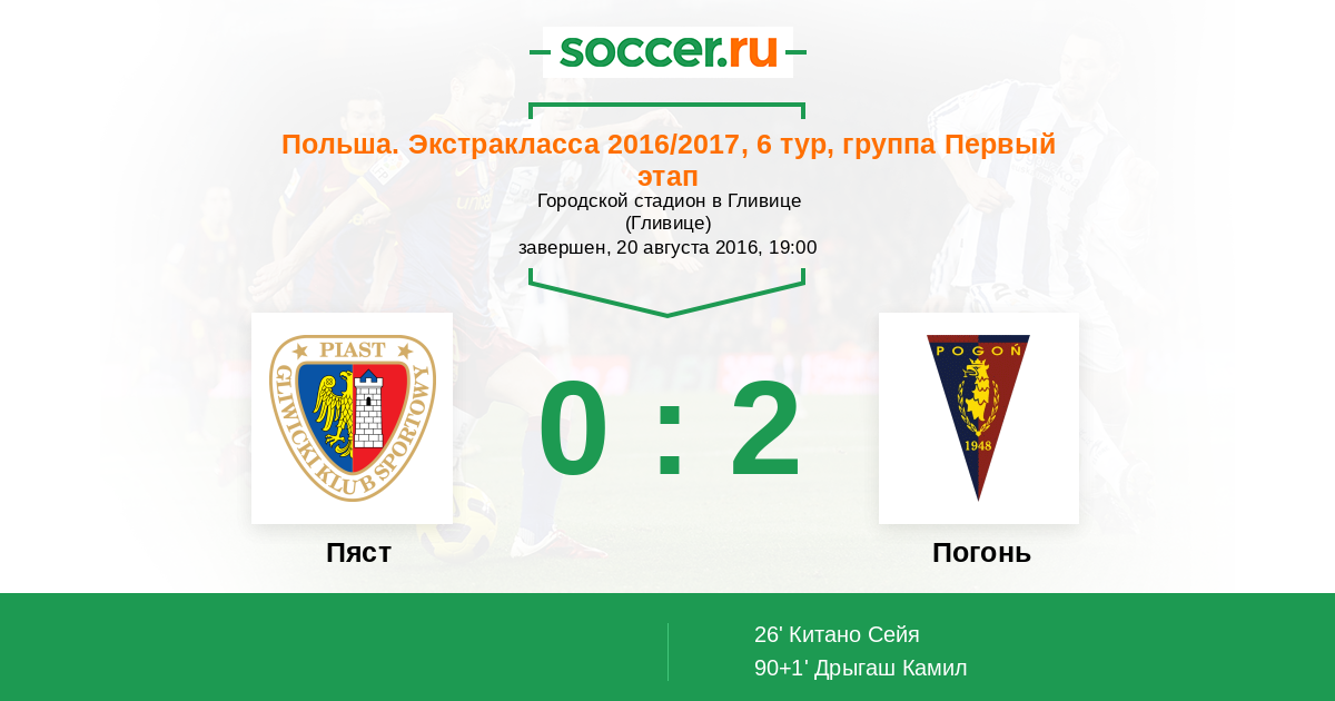 Польша. Экстракласса 22.07.2017 Пяст Логотип футбольный клуб Пяст (Гливице) 1:2 Логотип футбольный клуб Погонь (Щецин) Погонь