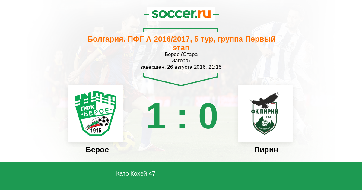 Болгария. Первая лига 02.08.2015 Берое Логотип футбольный клуб Берое (Стара-Загора) 1:0 Логотип футбольный клуб Пирин (Благоевград) Пирин