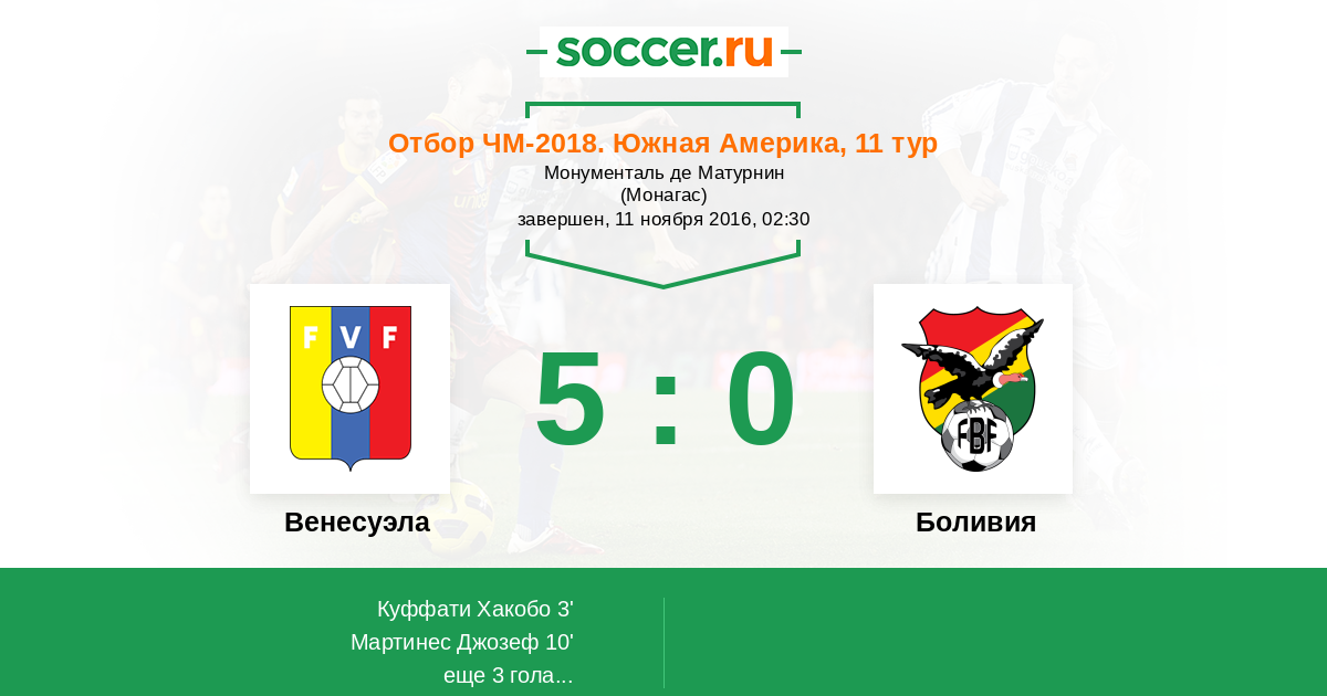 Отбор ЧМ. Южная Америка 12.11.2015 Боливия Логотип Боливия 4:2 Логотип Венесуэла Венесуэла