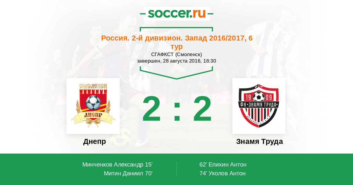 Россия. Вторая лига. Группа 2 04.09.2014 Знамя Труда Логотип футбольный клуб Знамя Труда (Орехово-Зуево) 0:2 Логотип футбольный клуб Днепр (Смоленск) Днепр