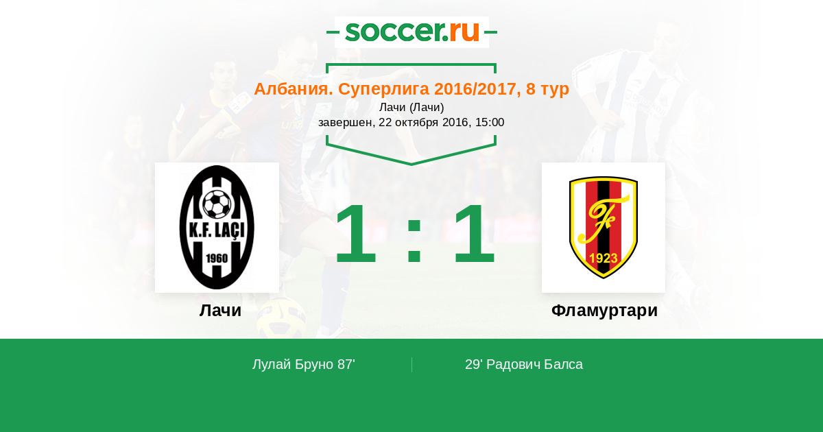 Албания. Суперлига 16.10.2017 Лачи Логотип футбольный клуб Лачи 1:1 Логотип футбольный клуб Фламуртари (Влера) Фламуртари