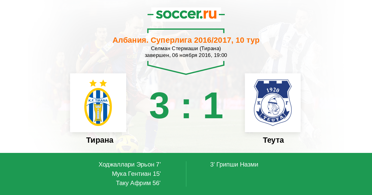 Албания. Суперлига 07.09.2016 Теута Логотип футбольный клуб Теута (Дуррес) 0:0 Логотип футбольный клуб Тирана Тирана