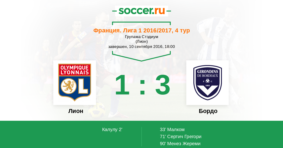 Франция. Лига 1 26.09.2015 Бордо Логотип футбольный клуб Бордо 3:1 Логотип футбольный клуб Лион Лион