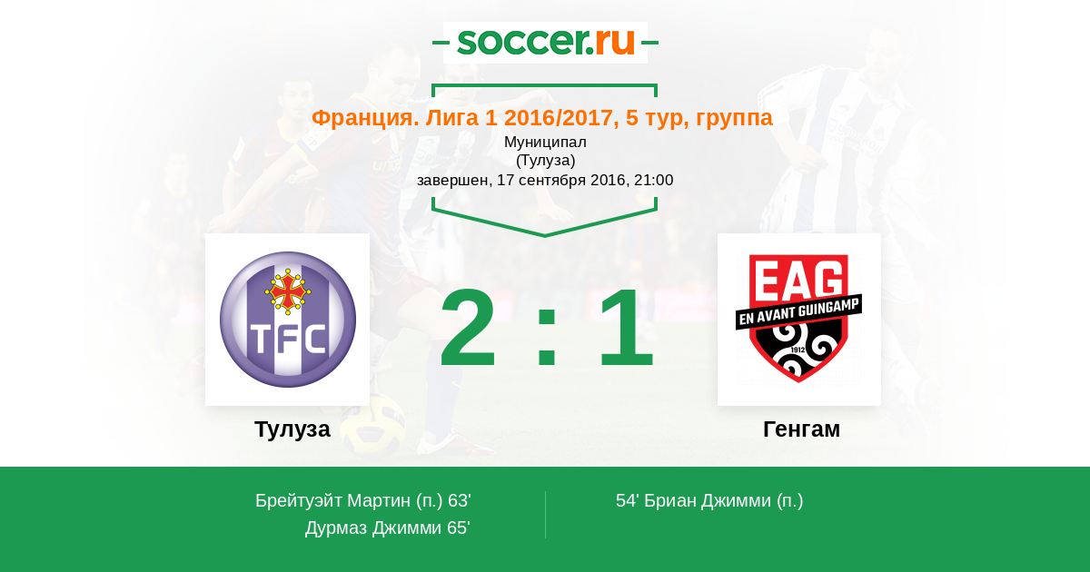 Франция. Лига 1 30.09.2017 Генгам Логотип футбольный клуб Генгам 1:1 Логотип футбольный клуб Тулуза Тулуза