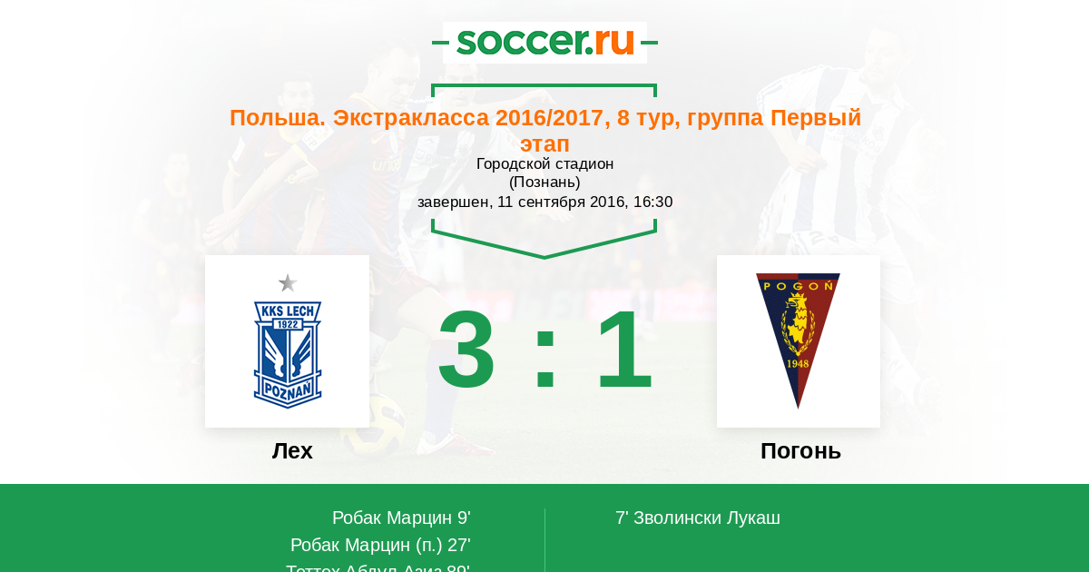 Польша. Кубок 01.03.2017 Лех Логотип футбольный клуб Лех (Познань) 3:0 Логотип футбольный клуб Погонь (Щецин) Погонь