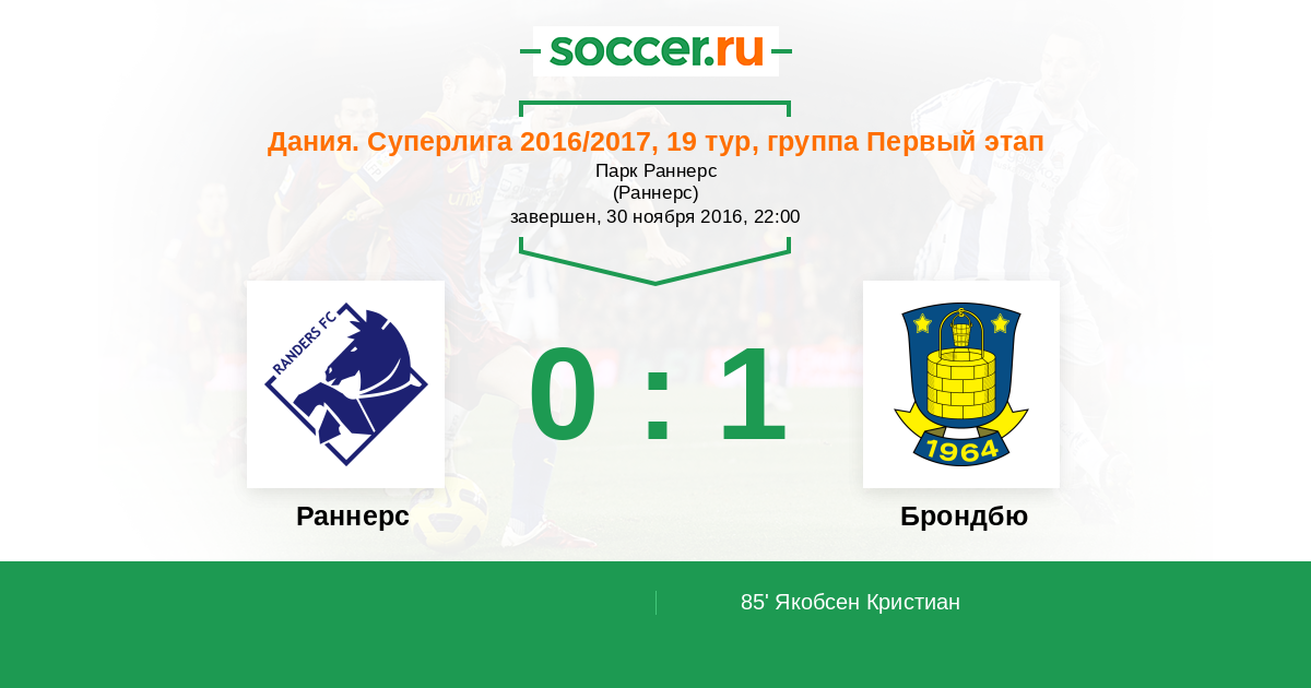 Дания. Суперлига 30.10.2017 Брондбю Логотип футбольный клуб Брондбю (Брённбю) 3:1 Логотип футбольный клуб Раннерс Раннерс
