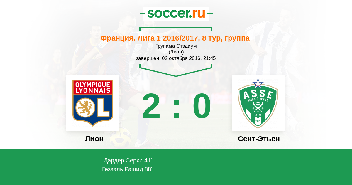 Франция. Лига 1 05.02.2017 Сент-Этьен Логотип футбольный клуб Сент-Этьен 2:0 Логотип футбольный клуб Лион Лион