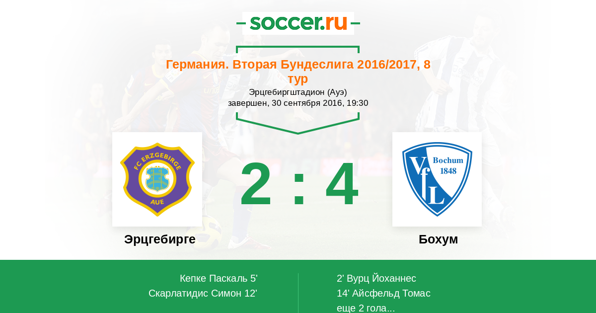 Германия. Бундеслига 2 27.10.2012 Эрцгебирге Логотип футбольный клуб Эрцгебирге (Ауэ) 6:1 Логотип футбольный клуб Бохум Бохум