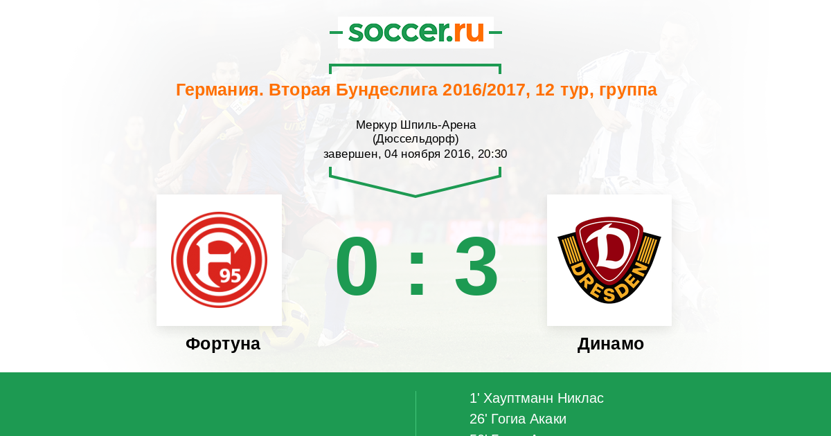 Германия. Бундеслига 2 27.11.2017 Фортуна Логотип футбольный клуб Фортуна (Дюссельдорф) 1:3 Логотип футбольный клуб Динамо (Дрезден) Динамо
